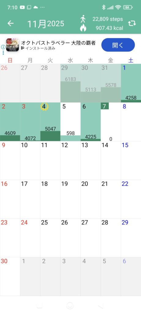 さて、結果から言うと、1週間で1日平均5,000歩を歩くことができました!実際に歩数の推移は以下の画像にまとめてありますので、ぜひチェックしてみてください。今回の挑戦期間は、10月29日から11月4日の1週間です。